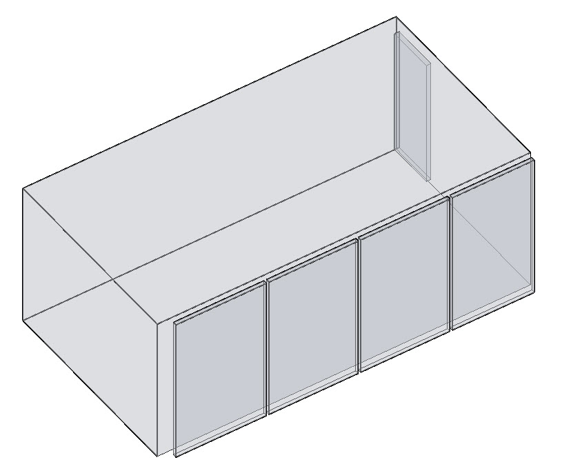 Poniższa ilustracja pokazuje wyizolowany model bryłowy, wykonany na potrzeby mojego projektu przykładowego, który ma przypisany parametr materiałowy, skojarzony z kolei z materiałem Szkło. Przezroczystość bryły ułatwia kontrolowanie dopasowania do budynku tworzonej bryły.