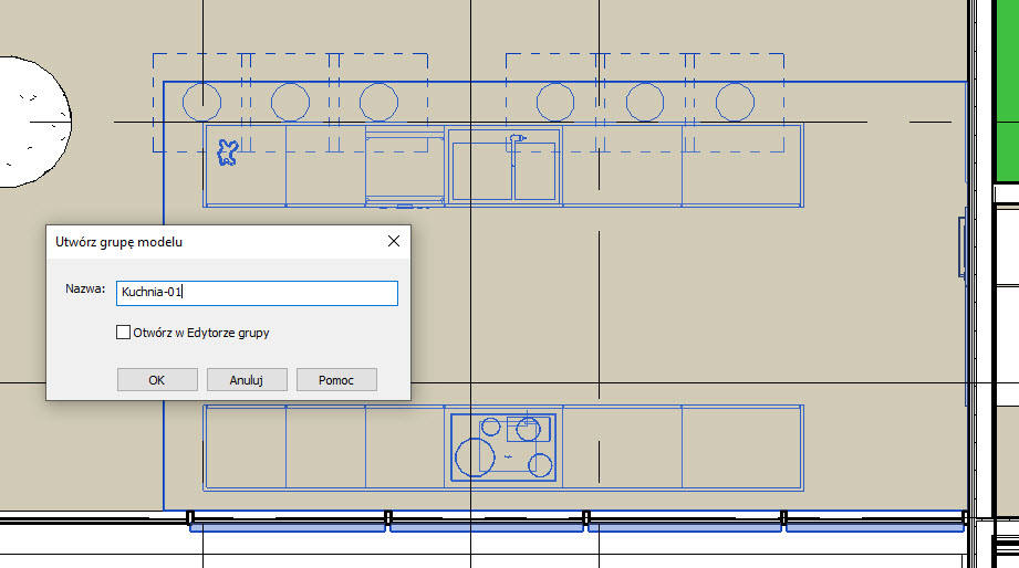 Pierwszym zadaniem będzie utworzenie grupy, wyznaczającej ramy przestrzenne dla projektu kuchni. Wymaga to rzecz jasna istnienia obiektów do zgrupowania. I tu trzeba wypracować własny schemat działania, zwłaszcza w sytuacji, kiedy jeszcze nie ma zbyt wielu obiektów modelu, które dałyby się zgrupować.