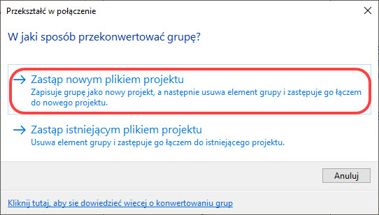 Tak przygotowaną grupę zamieniam na model podłączony Revit, poprzez jej wybranie i użycie polecenia Połączenie z kontekstowej części menu wstążkowego. Pojawia się okno dialogowe Przekształć w połączenie. W moim scenariuszu plik projektu kuchni nie istnieje, dopiero zamierzam do utworzyć z grupy, zatem właściwą opcją jest Zastąp nowym plikiem projektu. Pozostawiam nazwę systemową Taka jak nazwa grupy i umieszczam nowy projekt RVT w tym samy folderze, co model główny.