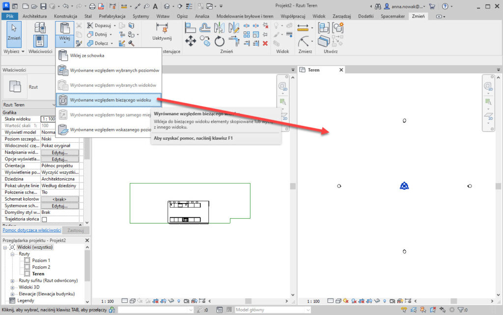 Aby to rozwiązać, tworzę nowy projekt na szablonie, poprawnym dla mojego wnętrzarskiego zadania. Najprostszą metodą, czyli poprzez kopiuj/wklej, przenoszę obiekty grupy do nowego projektu. W tym celu najlepiej w obu projektach otworzyć analogiczne widoki (najlepiej dwa rzuty poziome, aby można było wkleić obiekty opcją Wyrównane względem bieżącego widoku), dokonać skopiowania i wklejenia wszystkich potrzebnych obiektów jako wyrównane względem bieżącego widoku i zapisać nowy projekt w tej samej lokalizacji, co model główny i model utworzony z grupy.